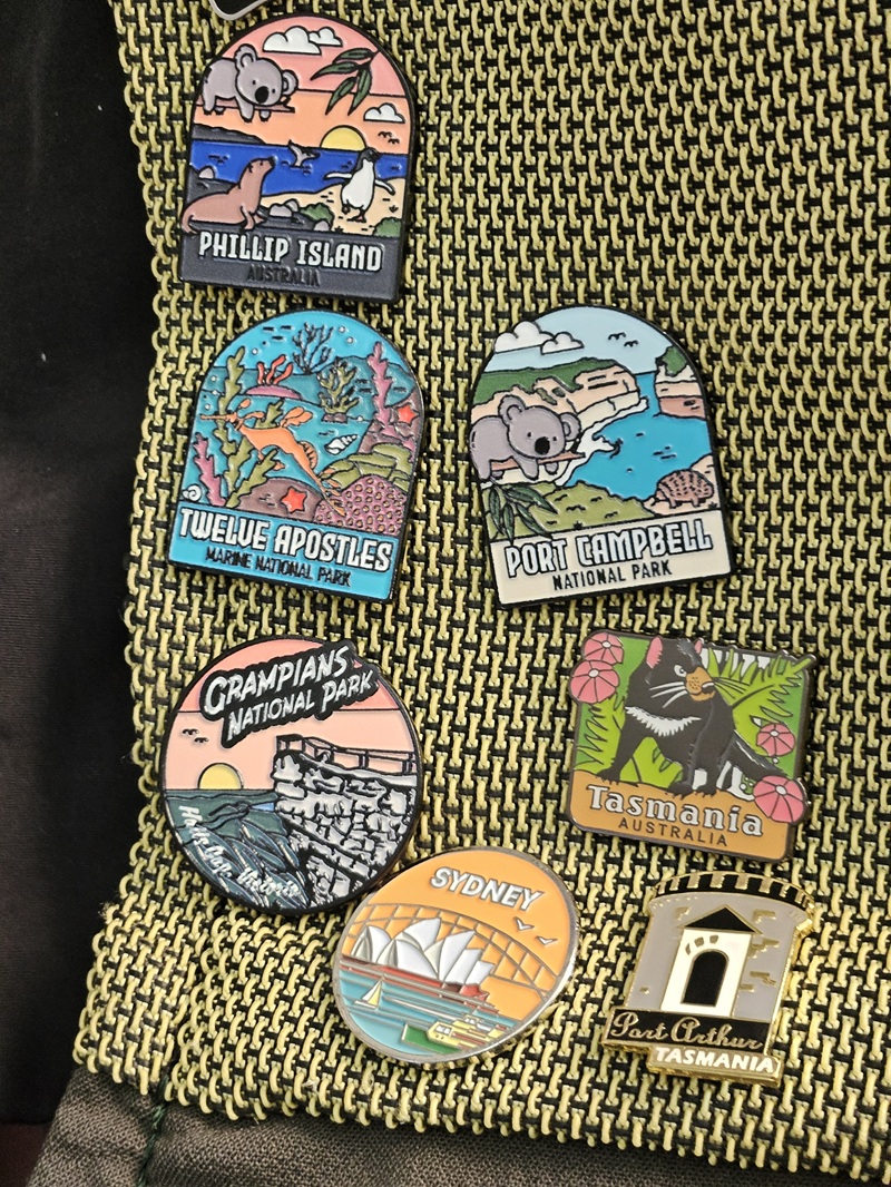 When I visit national parks I buy a metal National Park Pin to put on my jacket on the collar and down the sleeves. Because the backing on the pin doesn't secure the pin I have a bag of Locking Pin Backs to secure them to my jacket, I *STRONGLY* suggest the locking backs that come with a wrench, but be careful, too much tightning and you might pull off the pin on the back. After attaching I have had a couple of pins break off from the front. I wended up drilling a hole through and running a wire in the front and through the coat, see the Jedediah Smith Redwoods State Park pin. That fix is holding so far: